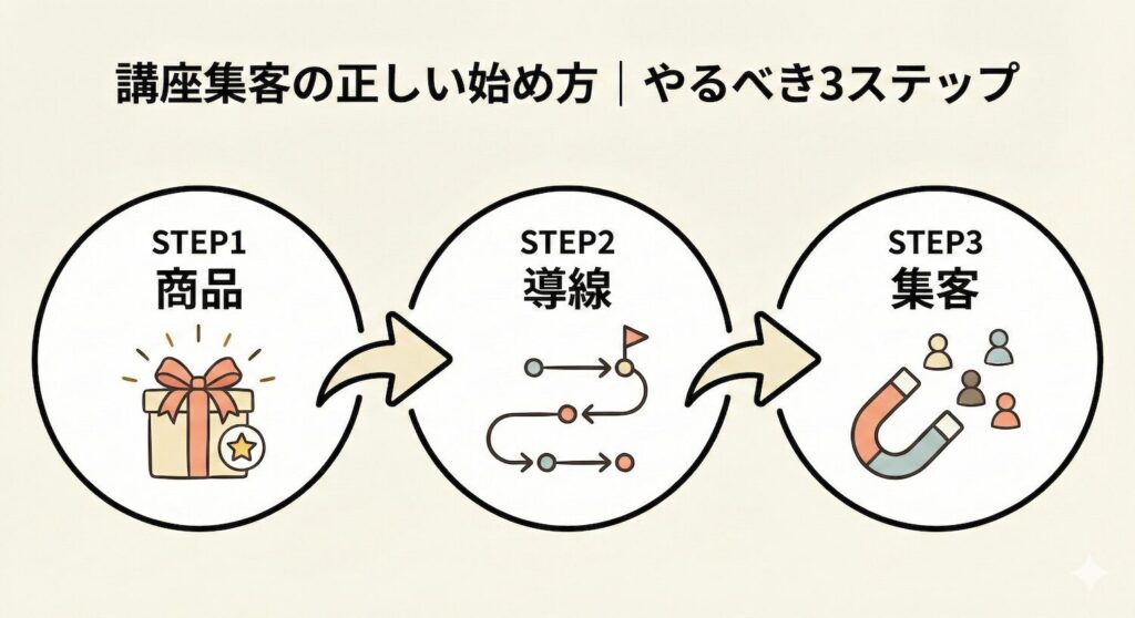 講座集客がうまくいかない人の多くは、「SNSを頑張る」「広告を出す」など、いきなり集客施策から始めてしまいます。