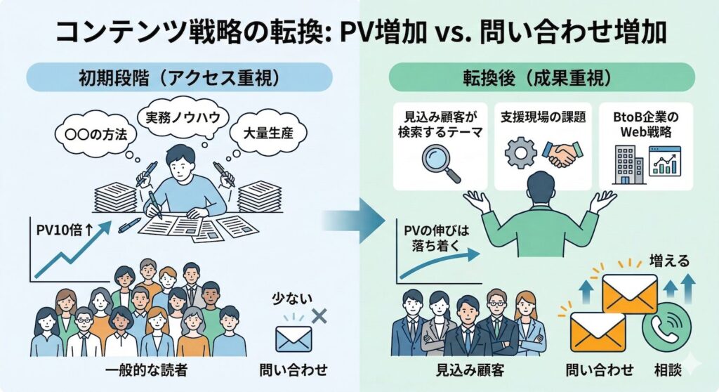 このあたりにテーマを絞って記事を書くようにしたところ、PVの伸びは落ち着いたものの、問い合わせや相談につながる記事が少しずつ増えてきました。