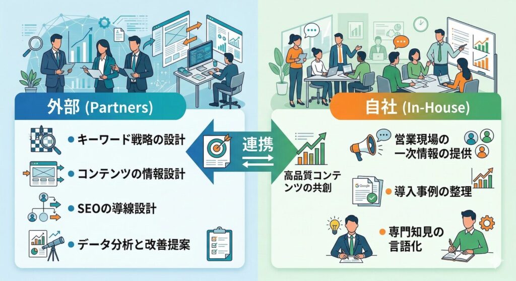 この役割分担を理解せずにSEOに取り組むと、「頑張って記事を書いているのに成果が出ない」という状況に陥りやすくなります。