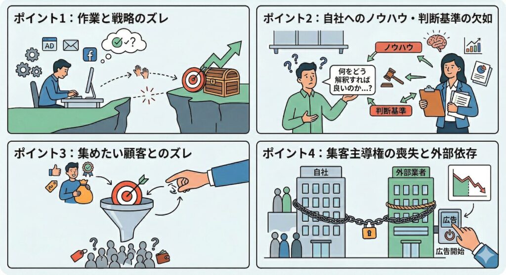ただし、何も考えずに完全丸投げしてしまうと、成果が出ないだけでなく、自社に判断基準も残らなくなります。
