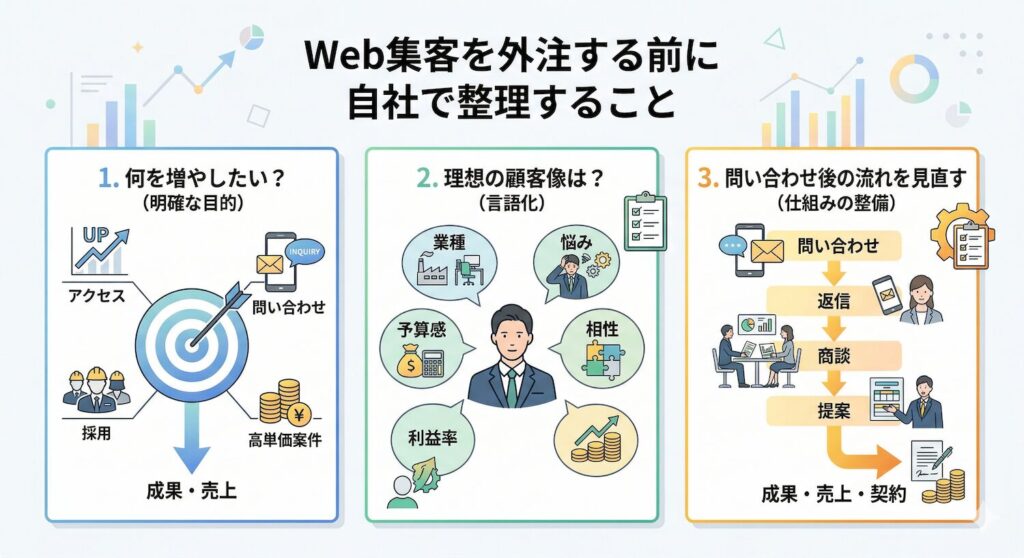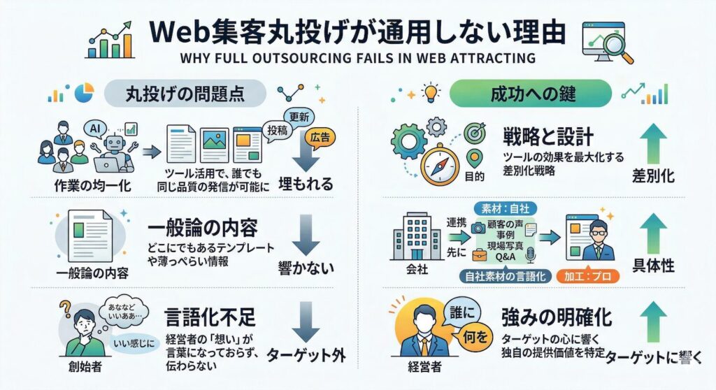 この記事では、Web集客丸投げが危険と言われる理由を整理したうえで、外注で失敗しないための考え方と、外注を消えるコストではなく、自社の資産に変える進め方を分かりやすく解説します。