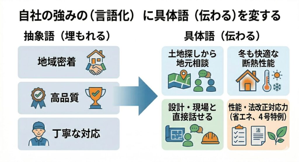 「地域密着」「丁寧な対応」「高品質な家づくり」といった言葉はよく見かけますが、それだけでは他社との違いは伝わりません。