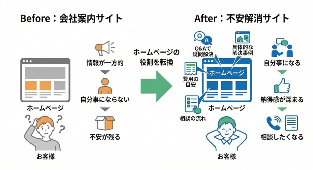 会社案内ではなく、検討者の不安を解消するサイトにする