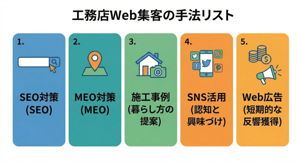 そのうえで、SEO、MEO、施工事例の強化、SNS、広告を役割ごとに使い分けていくと、無駄の少ない集客導線を作りやすくなります。