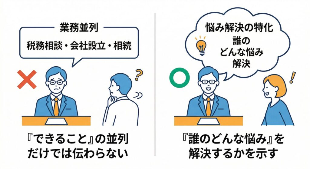 本当の理由は、多くの事務所が「何を提供しているか」は書いていても、「誰のどんな悩みに強いか」が伝わっていないからです。