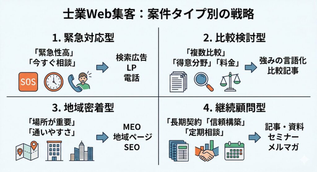 なぜなら、案件のタイプによって、見込み客の検索行動も、比較の仕方も、刺さる導線もまったく変わるからです。