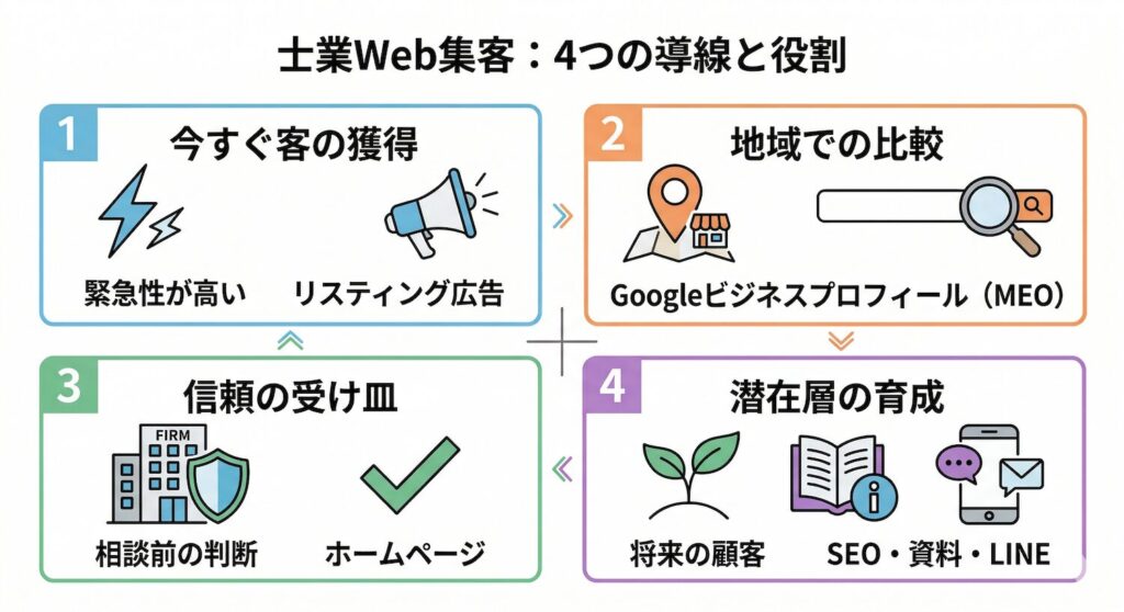 士業のWeb集客は、SEO、広告、MEO、ホームページなどを個別に考えるより、それぞれがどんな役割を担うのかで整理した方が分かりやすくなります。