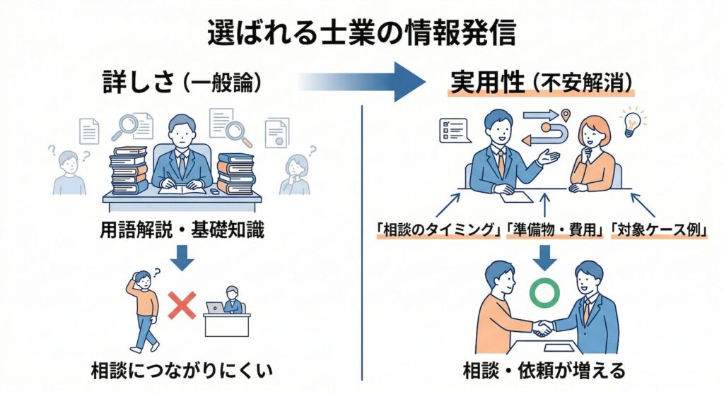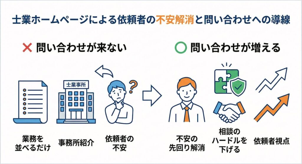 つまり、士業のWeb集客で重要なのは、事務所の立派さを見せることではなく、依頼者の不安を減らすことです。