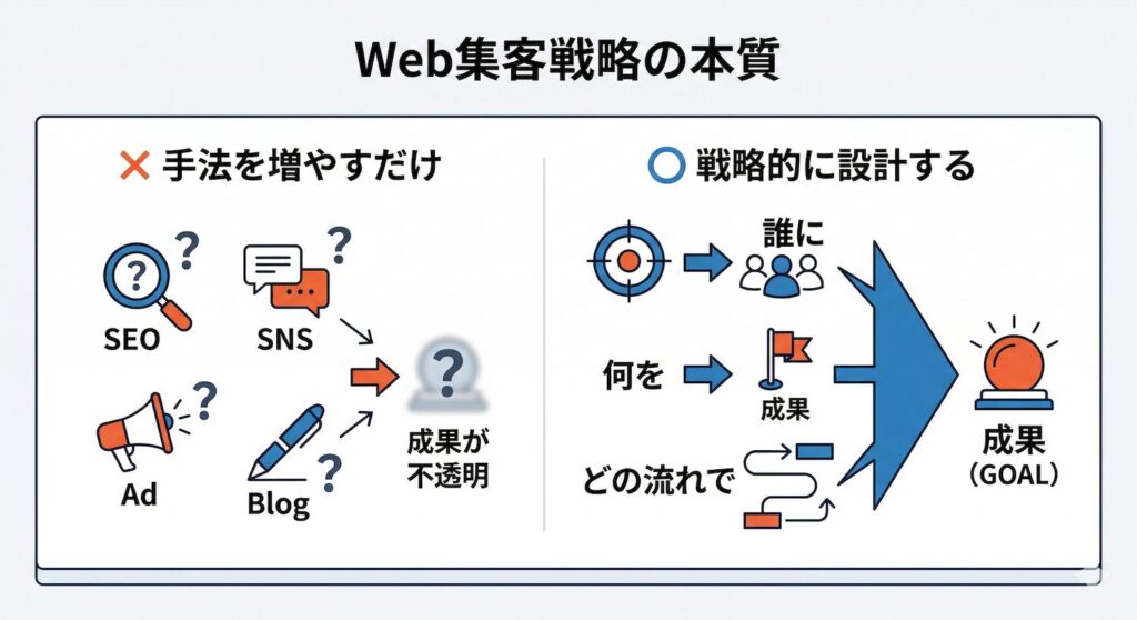 Web集客で成果を出すために必要なのは、手法を増やすことではなく、戦略を立てることです。