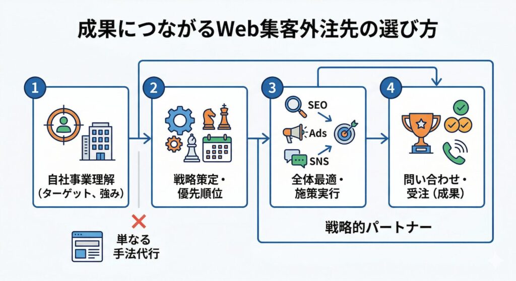 つまり、成果を出しやすい外注先は、SEO、広告、SNSといった個別の施策だけでなく、制作、導線、訴求、運用まで含めて全体を見てくれる会社です。